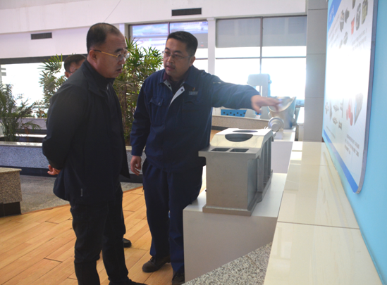 郭旭東陪同趙新明一行參觀一樓展廳,并詳細介紹了公司產品和工藝流程。