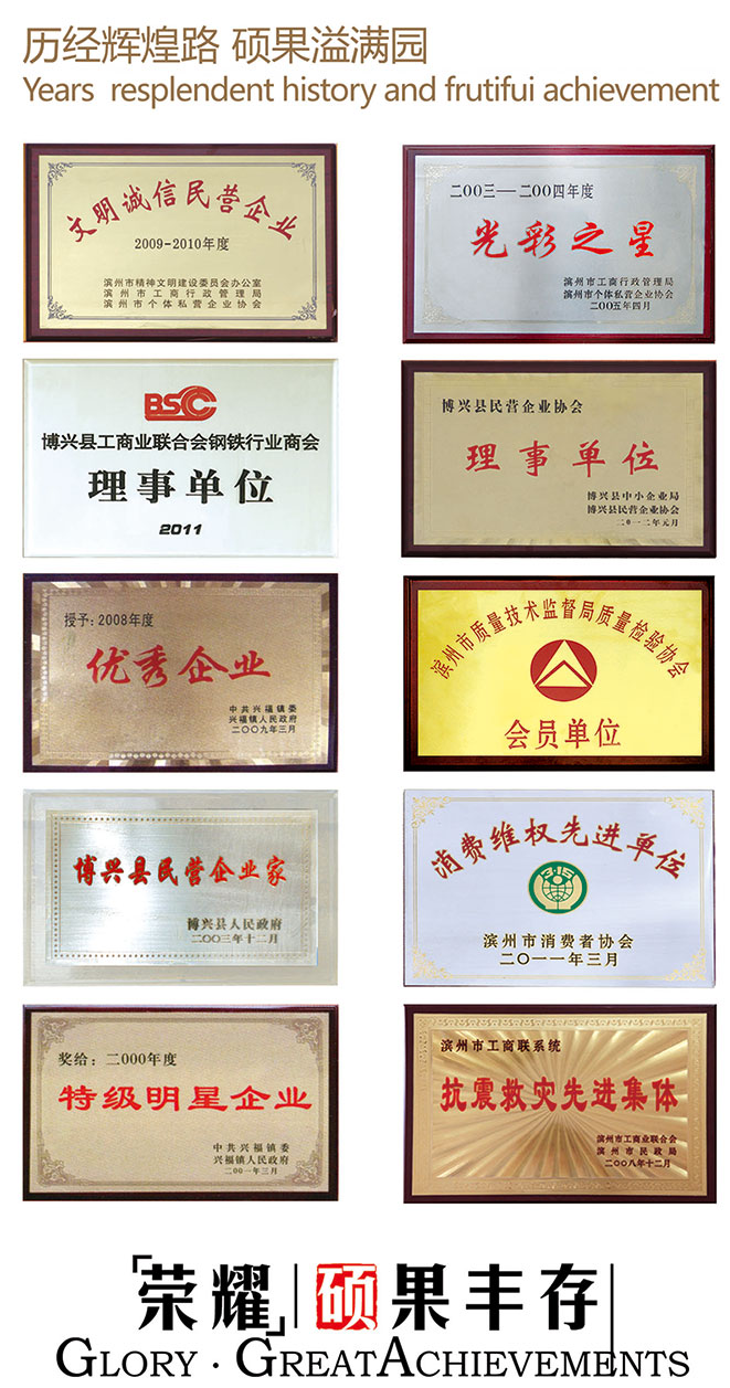 公司多次獲得“文明誠信民營企業(yè)”、“消費者維權(quán)先進單位”、“特級明星企業(yè)”、“興福鎮(zhèn)優(yōu)秀企業(yè)”、“濱州市工商管理局光彩之星”、“博興縣民營企業(yè)家”等榮譽稱號。
